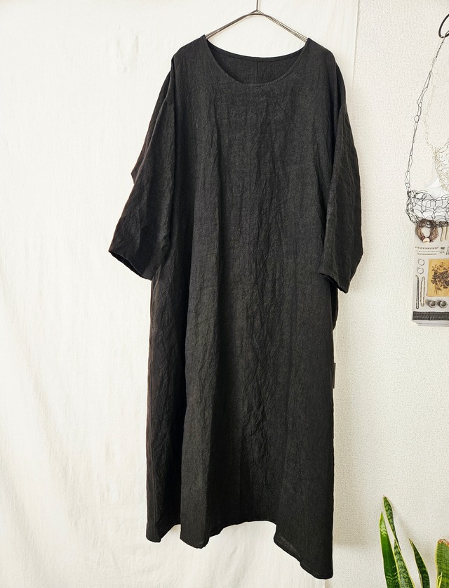 **hajimeru 黒リネンワンピース** ・通年使える魅力的な一枚 hajimeruの黒リネンワンピースは、シンプルでありながら洗練されたデザインが特徴です。リネン素材を使用しているため、夏は涼しげに、冬は重ね着で温かく、年間を通じて活躍すること間違いなしです。ベーシックなカラーはどんなシーンにもフィットし、スタイリングの幅を広げます。 ポケットあり ・動きやすさと心地よさを追求 このワンピースは、リネンならではの軽やかさとドレープ感を活かしており、日常のあらゆる動きをスムーズにサポートします。気取らないシルエットで、リラックスした着心地を提供しながらも、きちんと感も演出しますので、デイリーからオフィススタイルまで幅広く着回せます。 ・こだわりの素材感 hajimeruの黒リネンワンピースは、上質なリネンを使用。さらりとした肌触りと通気性の良さが魅力です。リネンは自然素材のため、環境にも配慮した選択です。 素材: リネン100% サイズ: フリーサイズ 着丈: 110cm前後 バスト:114cm前後 日本製 *商品の色、質感につきましては、ご利用されるモニター環境やブラウザにより、画面上の色と実際の色が多少異なる場合がございます。予めご了承ください。
