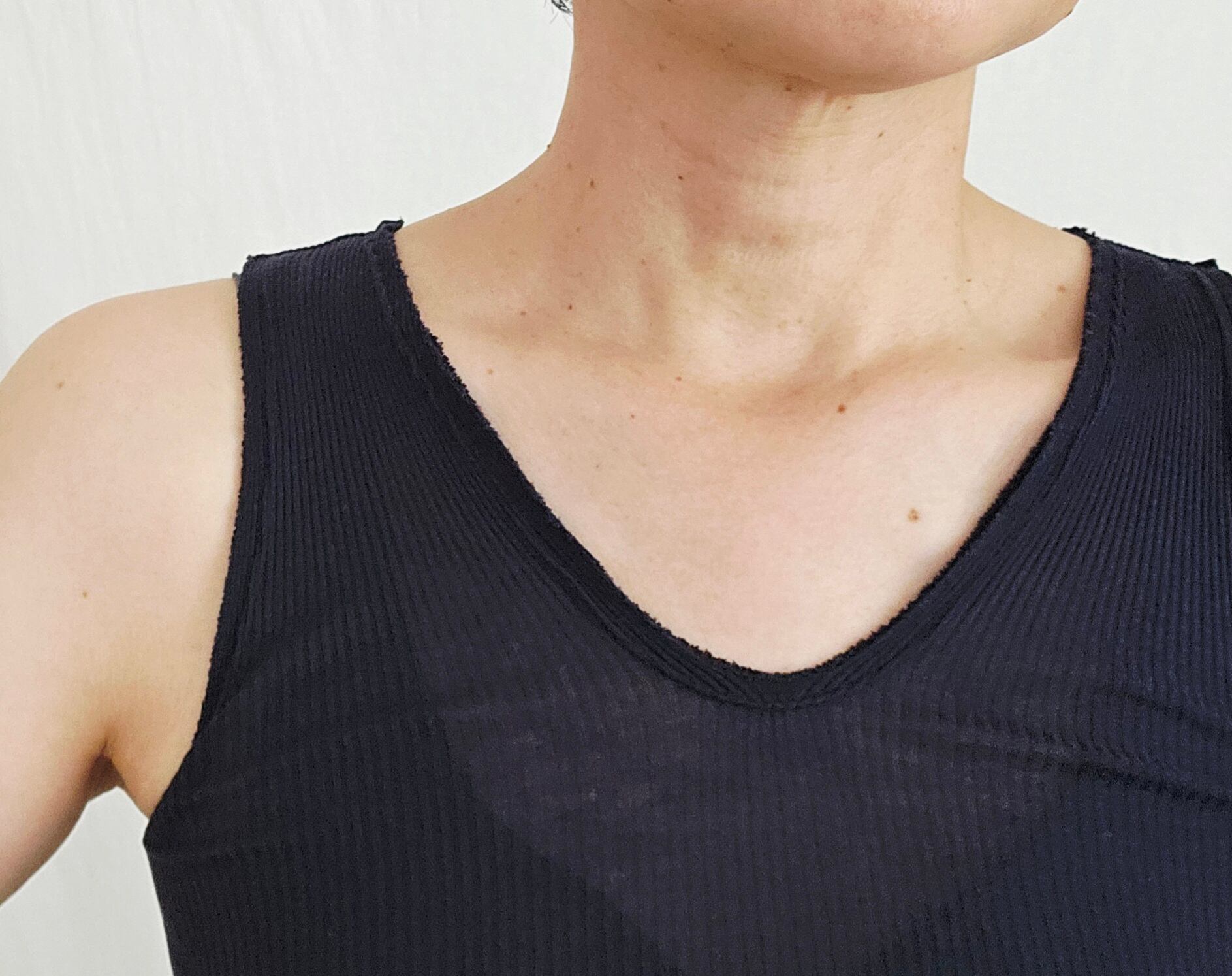 衿ぐりと袖ぐりは二本針ステッチでおさえてフラットに、端は断ち切りになっています。