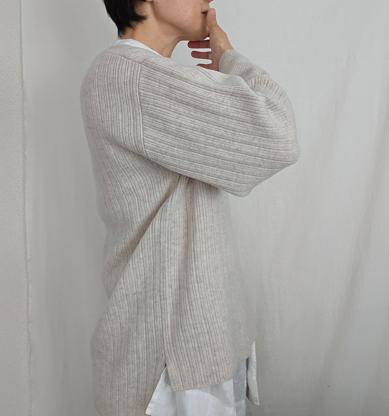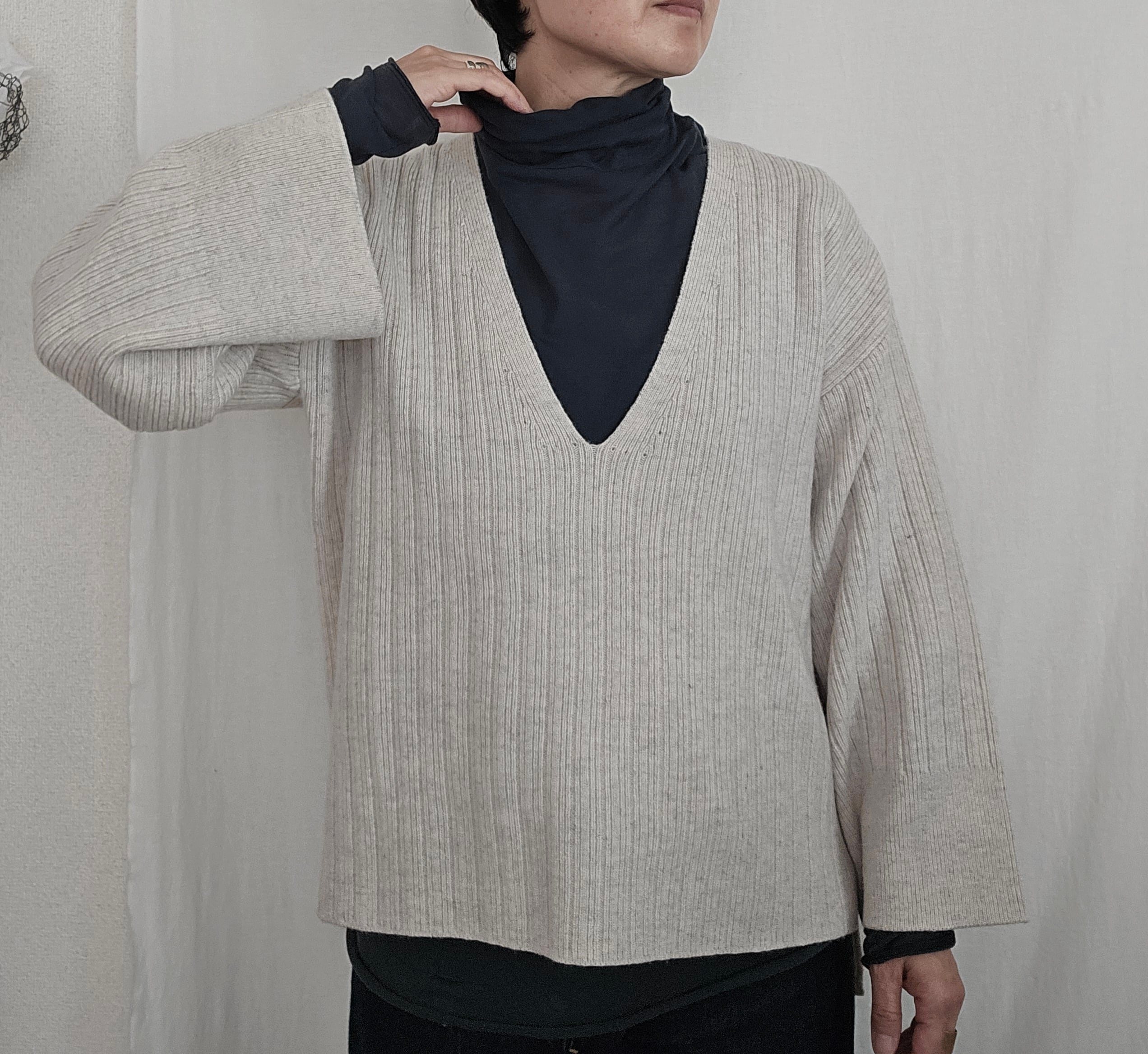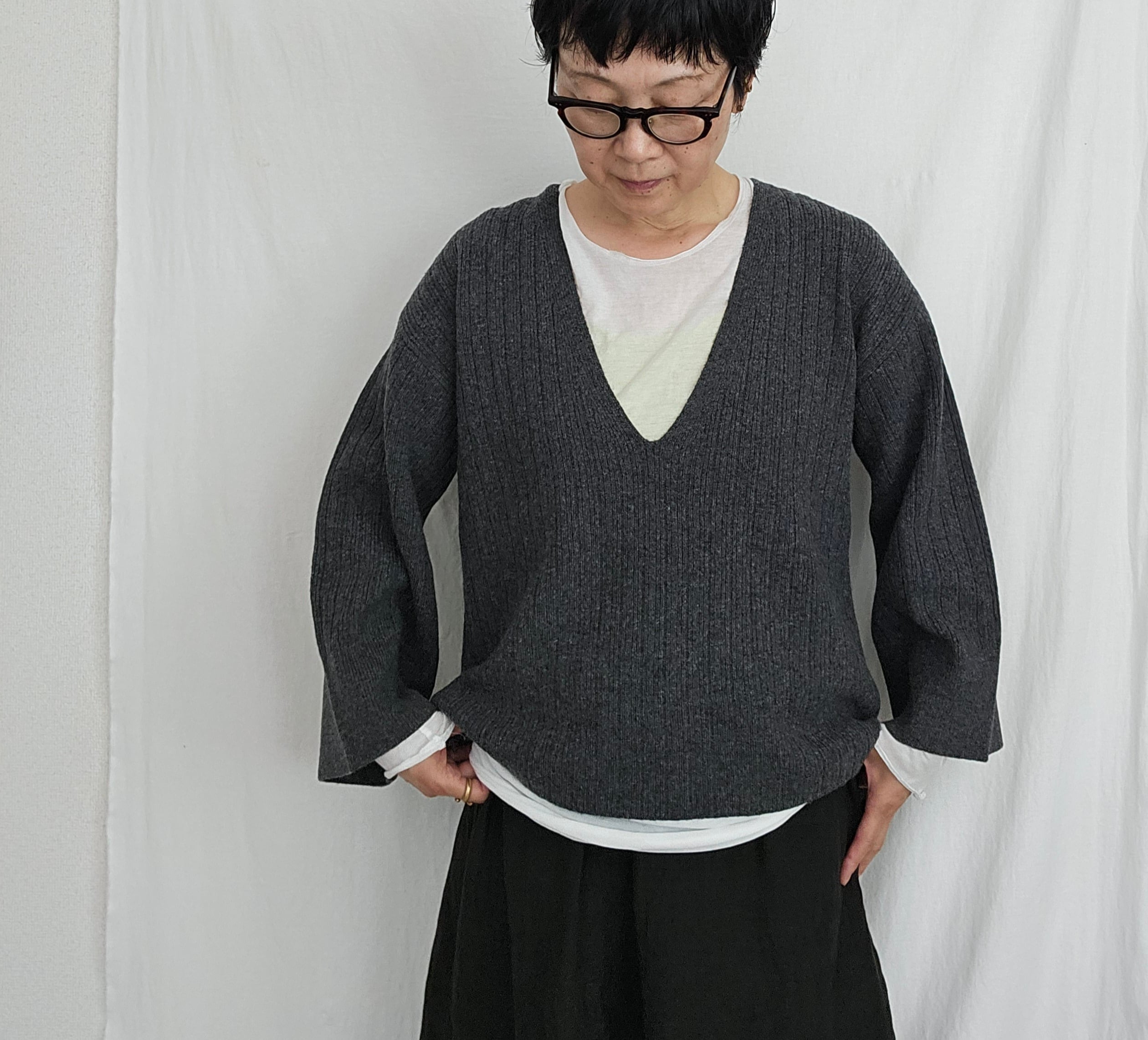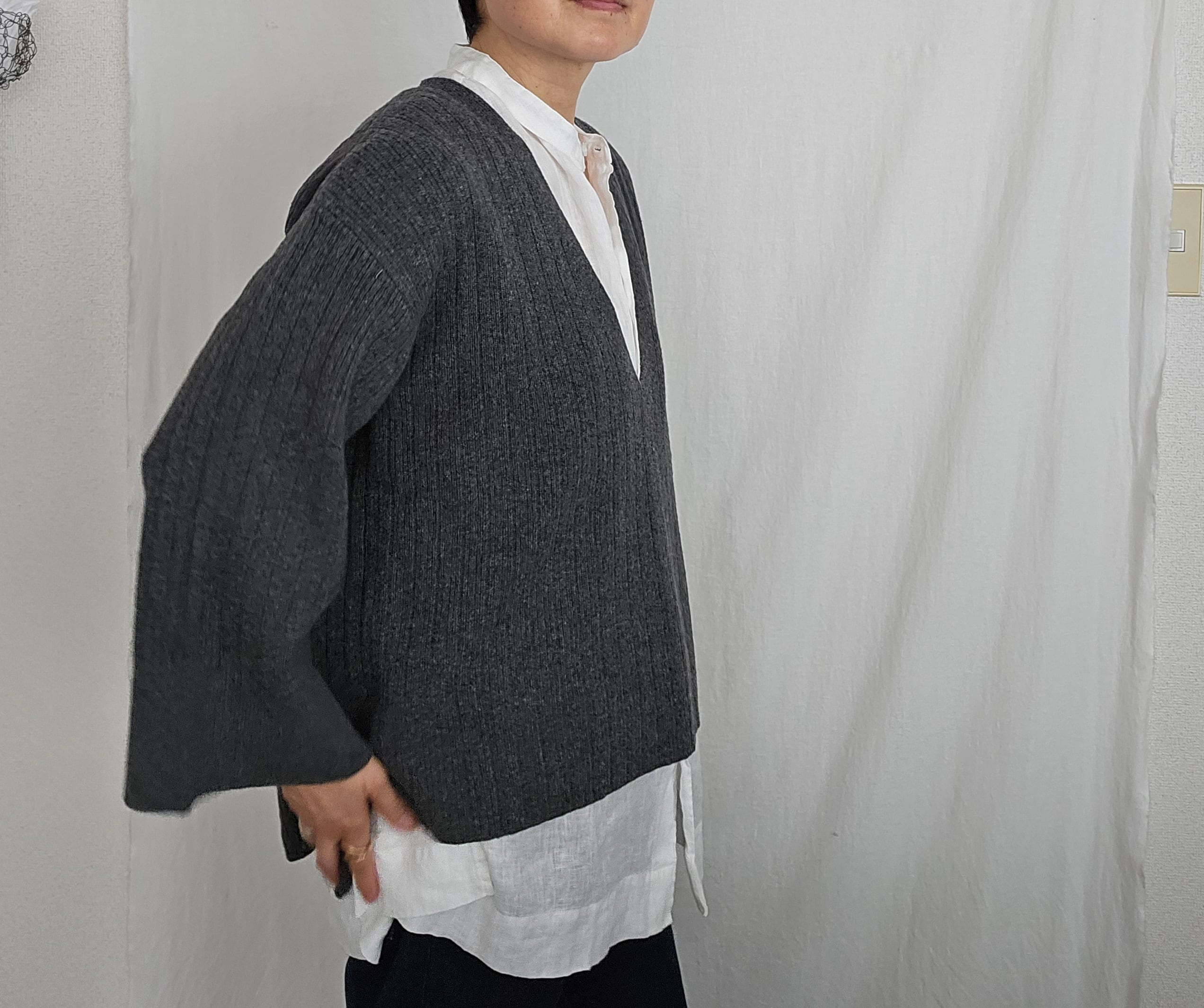 深いVネックや広い袖口が女性らしさを演出し、シャツやカットソーのレイヤードアイテムとして重宝します。