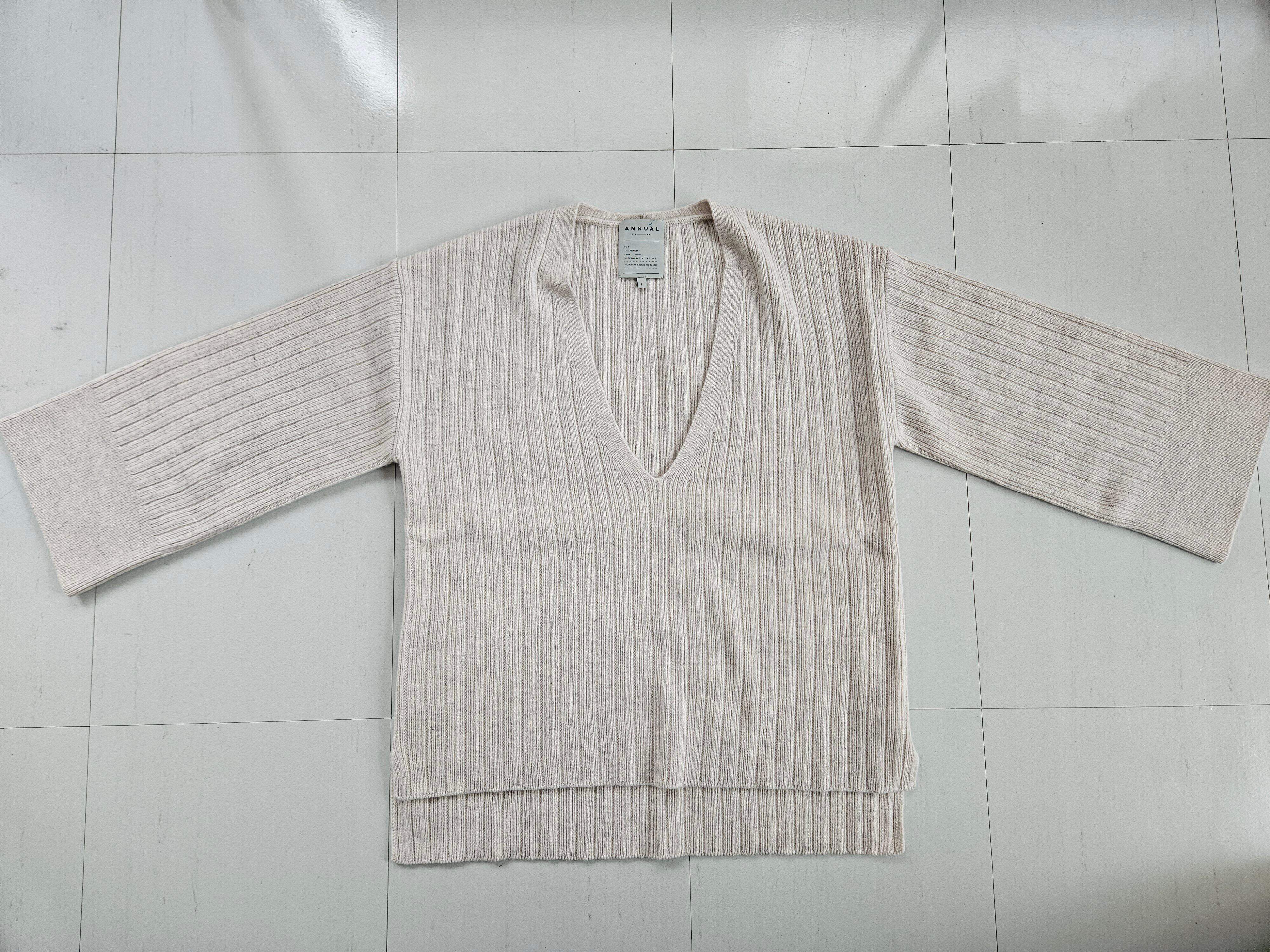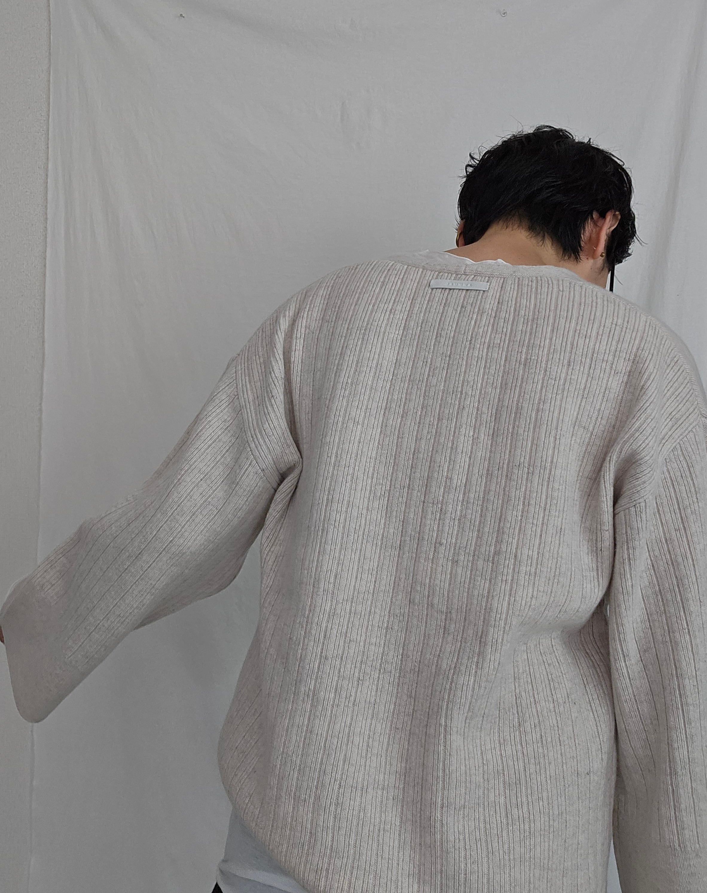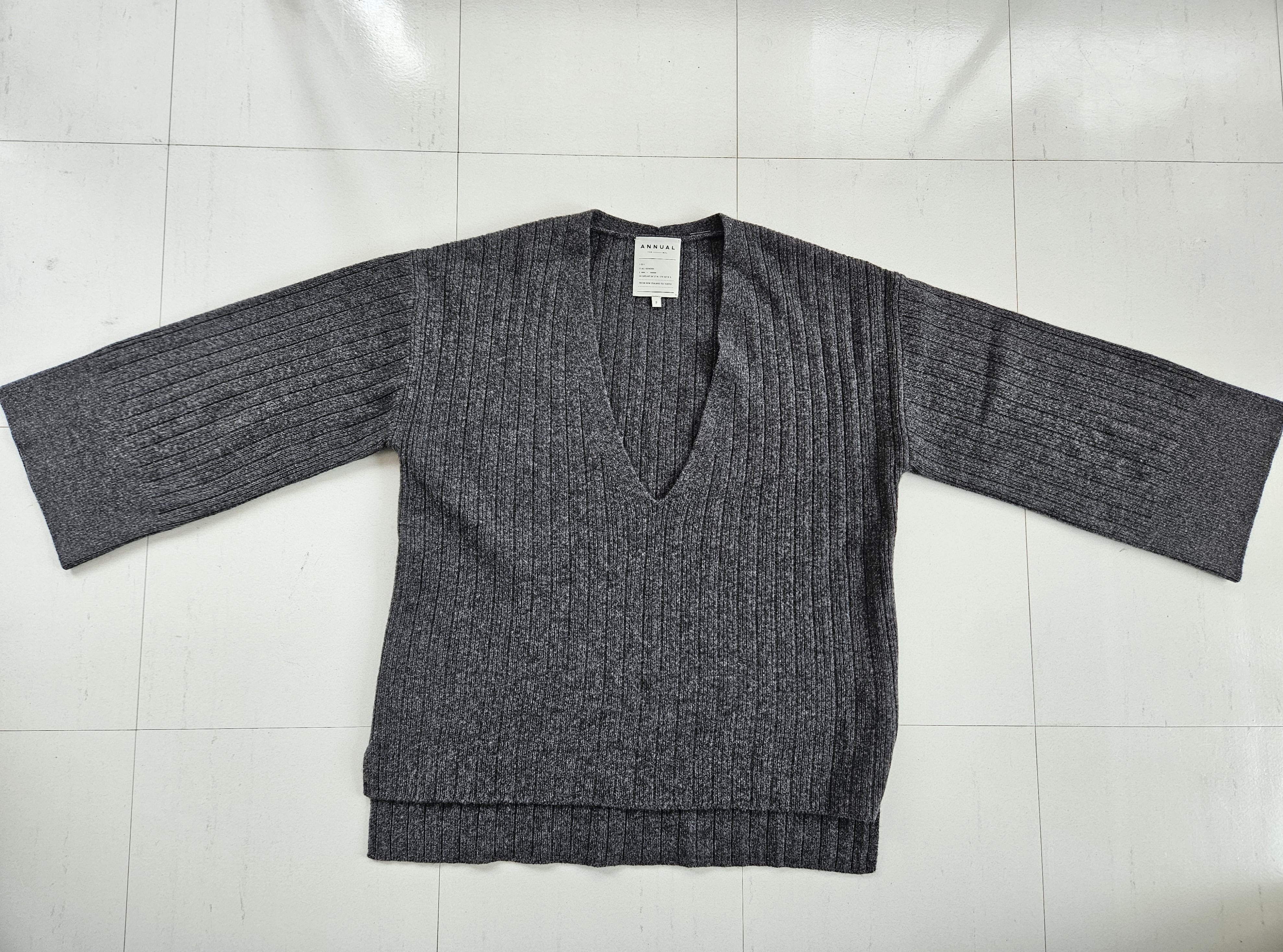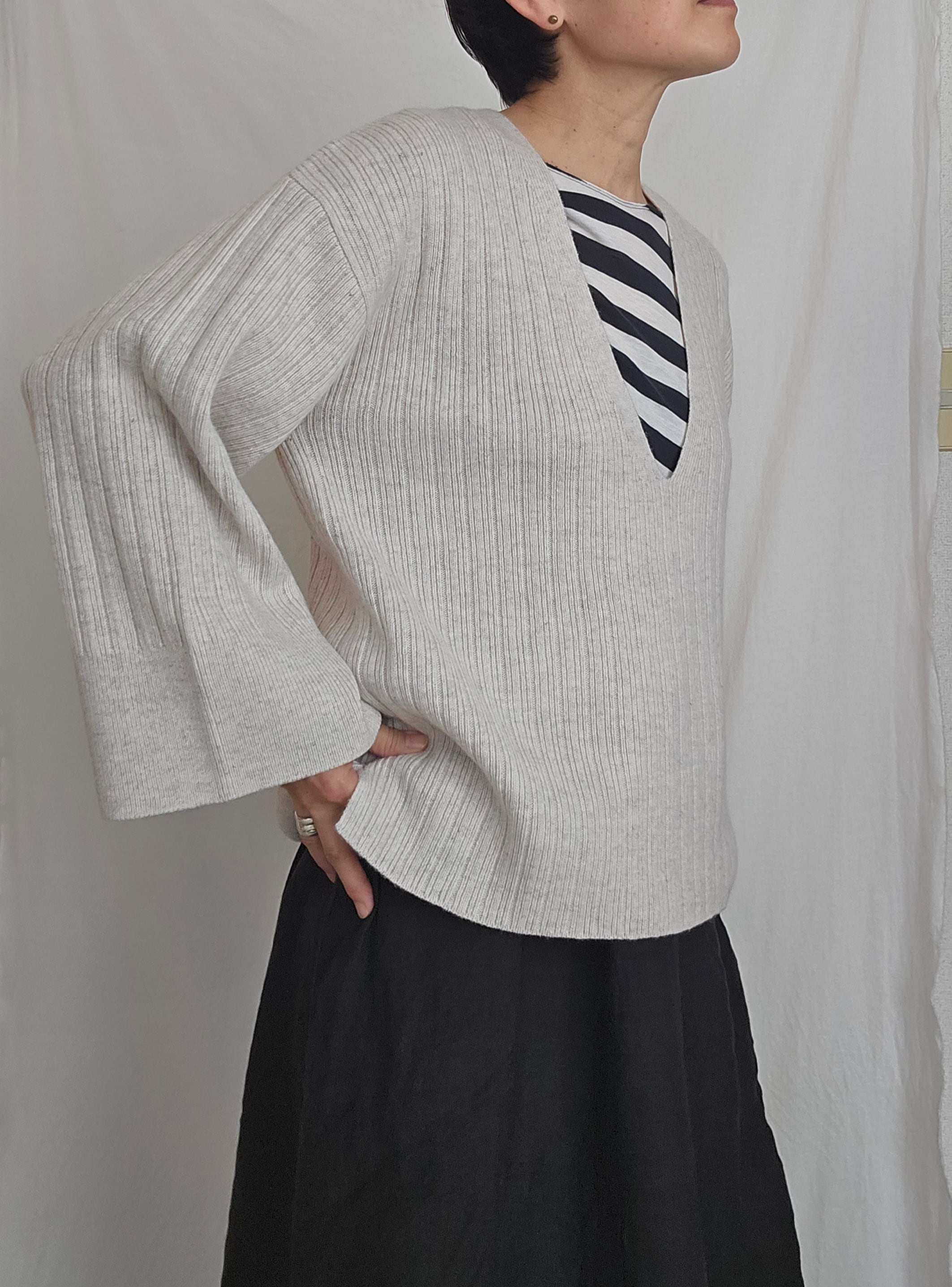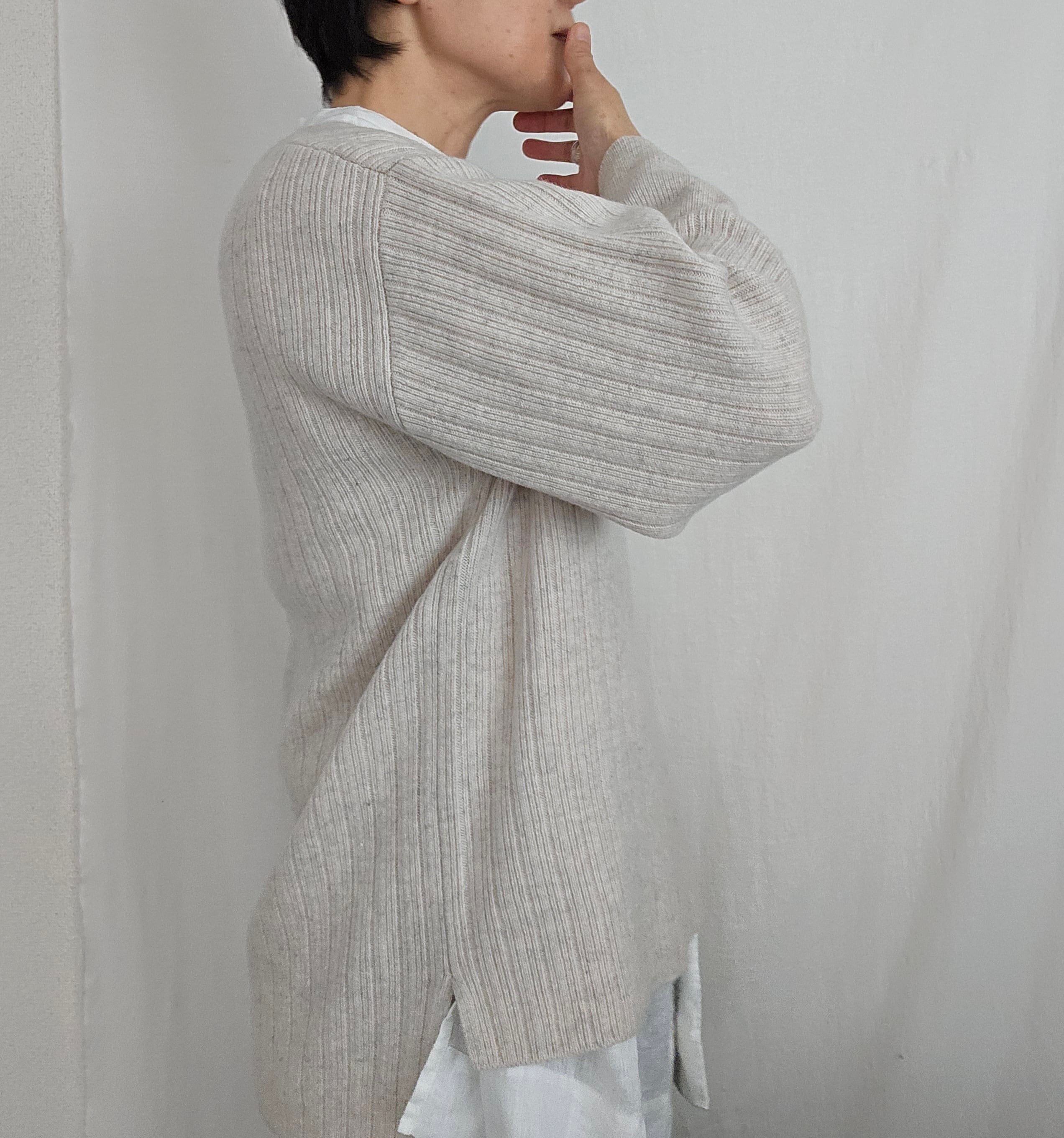 深いVネックや広い袖口が女性らしさを演出し、シャツやカットソーのレイヤードアイテムとして重宝します。